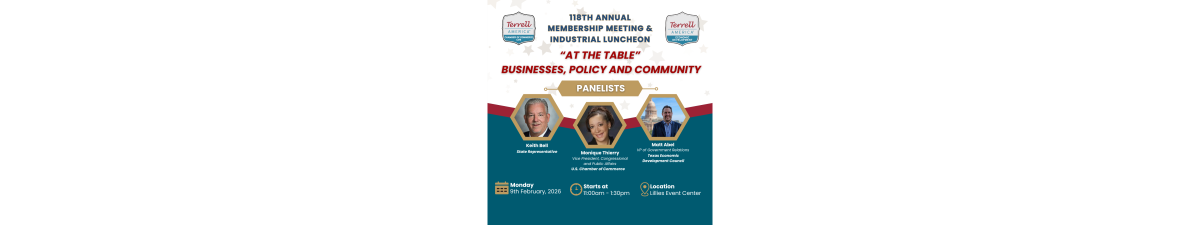 Join the Terrell Chamber of Commerce for a purposeful luncheon bringing together business leaders, civic partners, and community stakeholders for conversation and connection. This program will feature a moderated discussion on workforce challenges, policies that impact local businesses, and what business owners should be aware of as we approach the 2026 election cycle—all from a non-partisan, business-focused perspective.